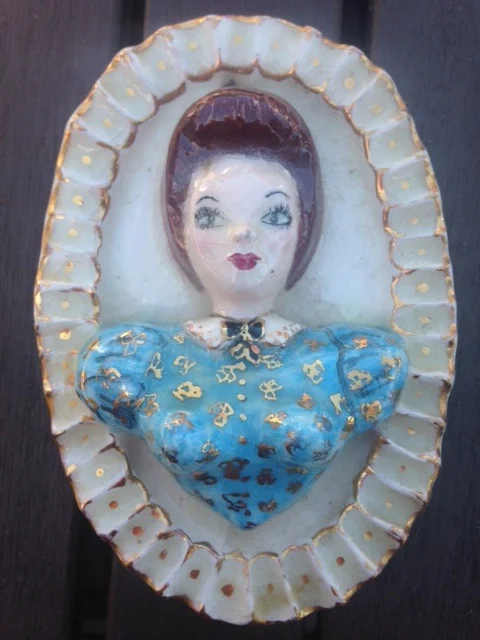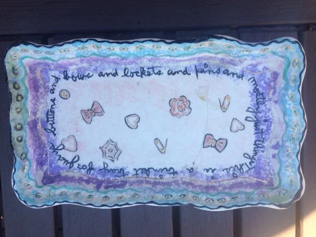 The plate reads, "This is a trinket tray for Judy's buttons and bows and lockets and pins and mostly just things" Gave to me when I was young.